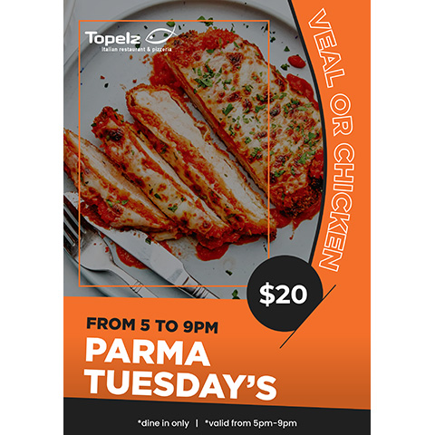 Topelz Italian Restaurant & Pizzeria offers 'a casual dining experience with a great menu of comfort food based on fresh local produce served and presented by attentive staff'. Vegetarian dishes (also Gluten free pizza and pasta) are available in entrees and main meals and separate menus are offered for children and teenagers. Large groups have the option of choosing from either the 'a la carte' or set menus.